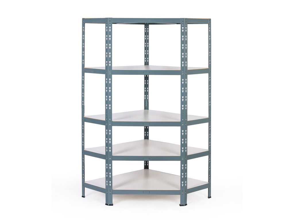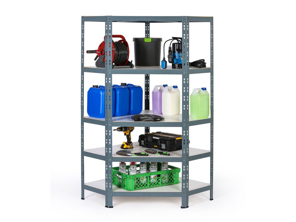 - stabilní rohový policový regál s rychlou montáží vhodný do skladů, dílen, sklepů a garáží