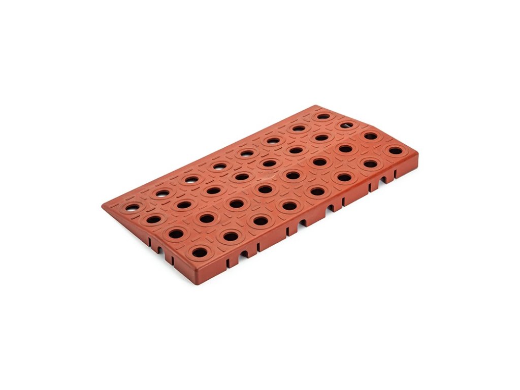 Nájezd rovný 250x137x16 mm slouží pro ukončení plastové podlahové plochy po stranách. Plynulý nájezd zabezpečí bezpečný vstup a nájezd na plochu. Povrch nájezdu je stejně děrovaný jako základní deska, spodní strana je žebrovaná a propojená kanály, které zajišťují rychlý a trvalý odvod vody pod povrchem podlahy. Barevnou kombinací nájezdů je možné současně označit okraje plochy v souladu s bezpečnostními předpisy (kombinace žluté a černé). Součástí dodávky jsou 6x4 spojky pro spojení s dalšími prvky. Výhodou systému je, že při poškození spojky se tato jednoduše vymění a nemusí se měnit celý díl. Na okraj dlouhý 1 metr jsou zapotřebí 4 ks nájezdů.