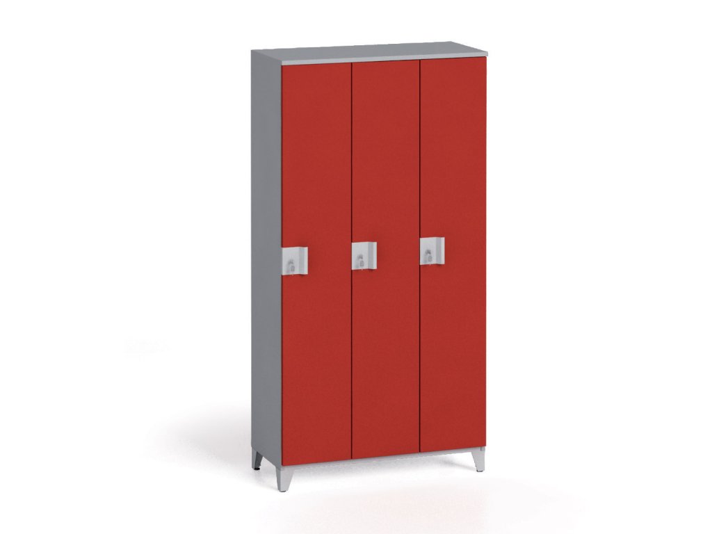 Šatní skříňka, 3 oddíly, 1750 x 900 x 400 mm, demont, otočný zámek, šedá/červená
