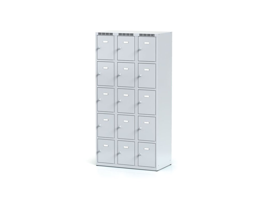 Skříňku s šířkou 300 mm tvoří 15 uzamykatelných boxů. Každý box poskytuje dostatek místa pro uložení osobních věcí, batohů či tašek. Toto úsporné a přitom bezpečné, uzamykatelné řešení je ideální všude tam, kde je potřeba šetřit místem a zároveň není nutné zavěšovat delší oděvy.