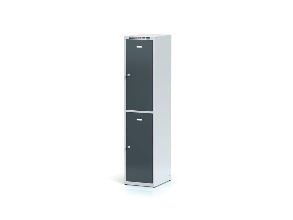 Potřebujete umístit větší množství šatních skříněk pro zaměstnance, návštěvníky, žáky či studenty a máte k dispozici omezené prostory? Řešením jsou šatní skříňky se 2 oddíly nad sebou. Tyto skříňky se skvěle hodí například do škol, sportovních hal, fitcenter, kde se nepředpokládá skladování pracovního oblečení. Každý oddíl je vysoký cca 850 mm a je vybaven šatní tyčí se 2 háčky. Dokoupit lze i přídavnou polici.
