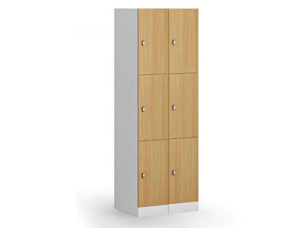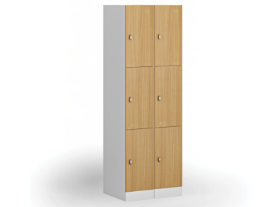 Kovová šatní skříňka s laminovanými dveřmi představuje elegantní kompromis - spojuje maximální odolnost ocelové konstrukce (0,6 mm) s reprezentativností dřeva.