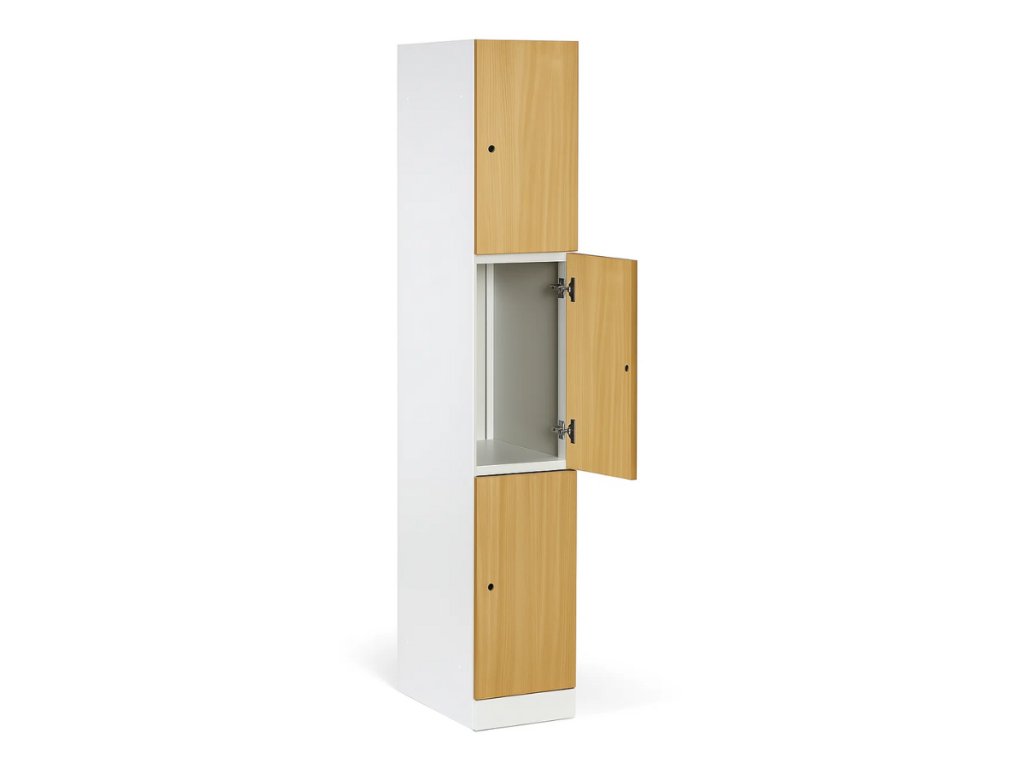 Skříňku s šířkou 300 mm tvoří 3 uzamykatelné boxy. Každý box poskytuje dostatek místa pro uložení osobních věcí, batohů či tašek. Toto úsporné a přitom bezpečné, uzamykatelné řešení je ideální všude tam, kde je potřeba šetřit místem a zároveň není nutné zavěšovat delší oděvy.