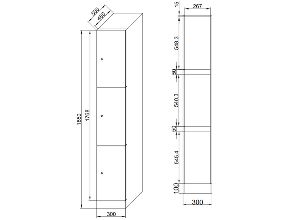 Skříňku s šířkou 300 mm tvoří 3 uzamykatelné boxy. Každý box poskytuje dostatek místa pro uložení osobních věcí, batohů či tašek. Toto úsporné a přitom bezpečné, uzamykatelné řešení je ideální všude tam, kde je potřeba šetřit místem a zároveň není nutné zavěšovat delší oděvy.