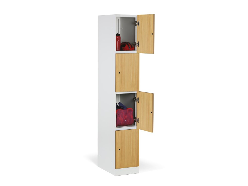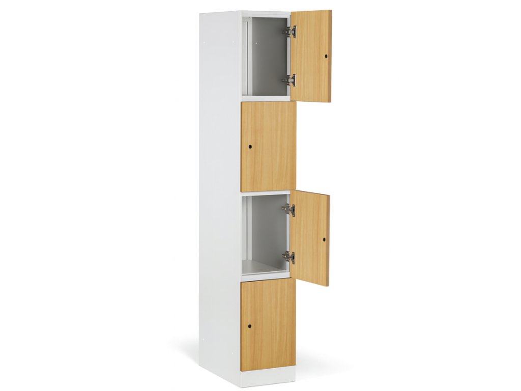 Skříňku s šířkou 300 mm tvoří 4 uzamykatelné boxy. Každý box poskytuje dostatek místa pro uložení osobních věcí, batohů či tašek. Toto úsporné a přitom bezpečné, uzamykatelné řešení je ideální všude tam, kde je potřeba šetřit místem a zároveň není nutné zavěšovat delší oděvy.