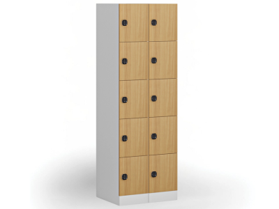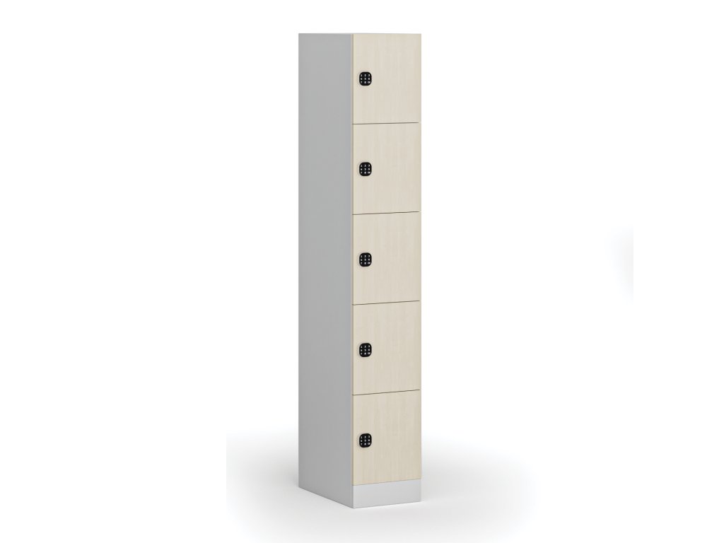 Šatní skříňka s úložnými boxy, 5 boxů, 1850 x 300 x 500 mm, demont, kódový zámek, laminované dveře, bříza
