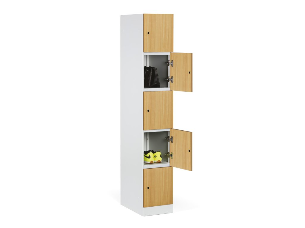 Skříňku s šířkou 300 mm tvoří 5 uzamykatelných boxů. Každý box poskytuje dostatek místa pro uložení osobních věcí, batohů či tašek. Toto úsporné a přitom bezpečné, uzamykatelné řešení je ideální všude tam, kde je potřeba šetřit místem a zároveň není nutné zavěšovat delší oděvy.