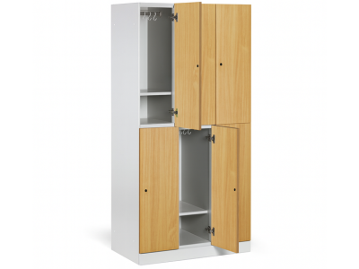 Kovová šatní skříňka s laminovanými dveřmi představuje elegantní kompromis - spojuje maximální odolnost ocelové konstrukce (0,6 mm) s reprezentativností dřeva.