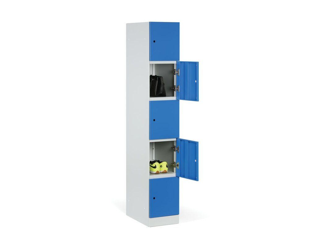 Skříňku s šířkou 300 mm tvoří 5 uzamykatelných boxů. Každý box poskytuje dostatek místa pro uložení osobních věcí, batohů či tašek. Toto úsporné a přitom bezpečné, uzamykatelné řešení je ideální všude tam, kde je potřeba šetřit místem a zároveň není nutné zavěšovat delší oděvy.