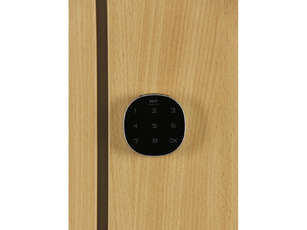Dveře jsou osazeny elektronickým kódovým zámkem s dotykovou číselnou klávesnicí. Skříňku snadno a rychle odemknete zadáním PIN kódu (bez použití klíče). Zámek se napájí baterií CR2032 (není součástí balení) a nabízí jednoduché ovládání, dlouhou výdrž i indikaci slabé baterie. Nastavit lze uživatelský i manažerský kód. Elegantní provedení v černo-stříbrné barvě.