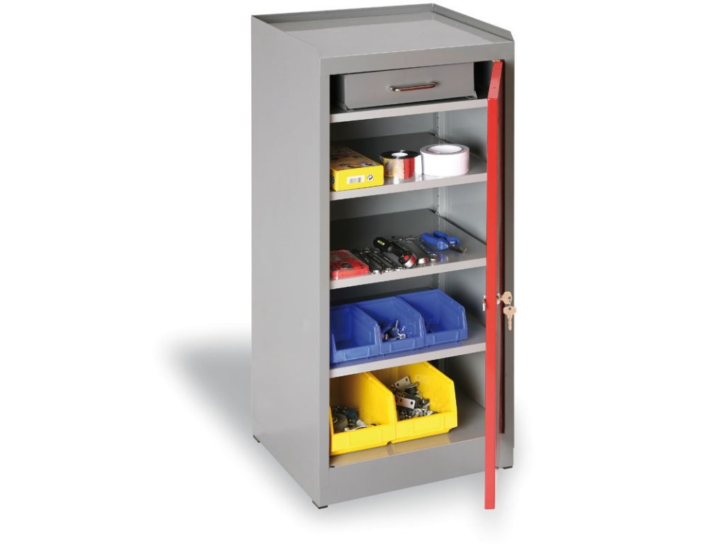 Dílenská policová skříňka na nářadí, 3 police, 1 zásuvka, 450 x 450 x 1020 mm, červené dveře
