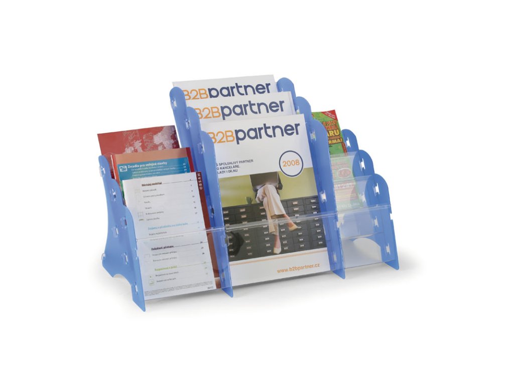 Stolní plastový stojan na prospekty, 3 x A4/3xA5/3xDL, modrý