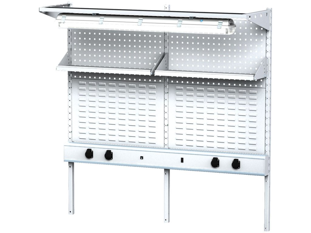 Nástavba na stůl MECHANIC II, děrovaný plech na nářadí + police, osvětlení a zásuvky, délka 1500 mm