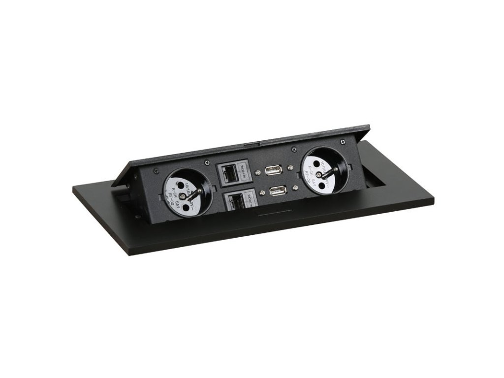Výklopná zásuvková lišta TYP III integrovaná ve stole je vyrobena ze slitiny zinku a železa. Obsahuje dvě elektrické zásuvky (francouzský typ), dva datové USB 2.0 porty a dva síťové konektory RJ-45 (cat5E) pro snadné připojení a nabíjení zařízení přímo na pracovní ploše stolu. Dostupná ve stříbrné / černé barvě nabízí elegantní skryté řešení nejen pro kanceláře, konferenční místnosti, ale i knihovny a studovny. Stupeň krytí je IP10.