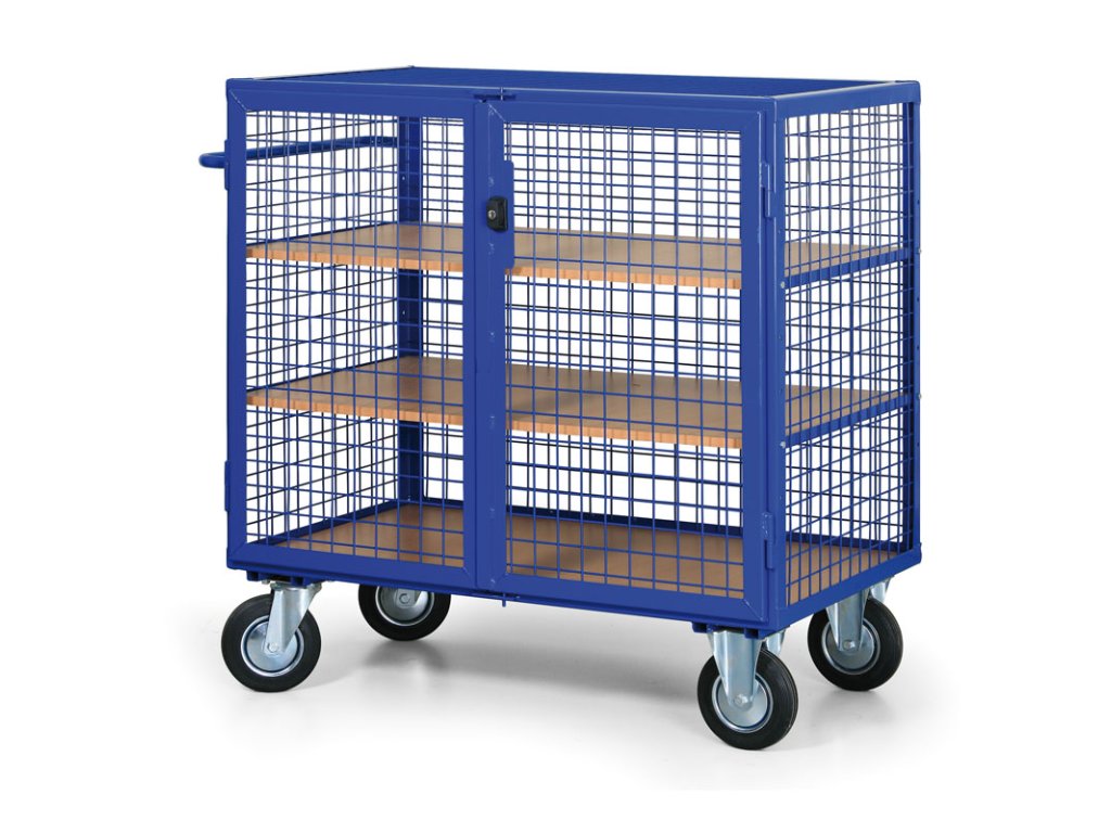 Tento vozík slouží k přepravě a uskladnění položek, které potřebujete chránit před odcizením. Velikost plošiny je 1200 x 800 mm a celková výška 1250 mm. Nosnost vozíku je 600 kg. Pevná svařovaná konstrukce zajišťuje stabilitu. Kostra vozíku je svařena z ocelových profilů. Stěny a horní víko jsou z pletiva s oky 50 x 50 mm, nebo ze zinkovaného plechu. Vozík je vybaven dvojitými křídlovými dveřmi s cylindrickým zámkem. Součástí dodávky jsou dva klíče. Kola na vozíku jsou vybavena poklicí, která brání namotávání nití a provázků a také zanášení ložiska různými nečistotami, čímž se prodlužuje životnost, jsou o průměru 200 mm, dvě pevná a dvě otočná podle vlastní osy. Jedno otočné kolečko vybaveno brzdou. Kovové části jsou lakovány práškovým lakem RAL 5005. Dno je z laminované dřevotřísky, která je vsazena do ocelového rámu. Police z laminované dřevotřísky jsou přestavitelné po 10 cm.