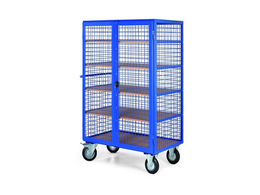 Tento vozík slouží k přepravě a uskladnění položek, které potřebujete chránit před odcizením. Velikost plošiny je 1200 x 800 mm a celková výška 1250 mm. Nosnost vozíku je 600 kg. Pevná svařovaná konstrukce zajišťuje stabilitu. Kostra vozíku je svařena z ocelových profilů. Stěny a horní víko jsou z pletiva s oky 50 x 50 mm, nebo ze zinkovaného plechu. Vozík je vybaven dvojitými křídlovými dveřmi s cylindrickým zámkem. Součástí dodávky jsou dva klíče. Kola na vozíku jsou vybavena poklicí, která brání namotávání nití a provázků a také zanášení ložiska různými nečistotami, čímž se prodlužuje životnost, jsou o průměru 200 mm, dvě pevná a dvě otočná podle vlastní osy. Jedno otočné kolečko vybaveno brzdou. Kovové části jsou lakovány práškovým lakem RAL 5005. Dno je z laminované dřevotřísky, která je vsazena do ocelového rámu. Police z laminované dřevotřísky jsou přestavitelné po 10 cm.