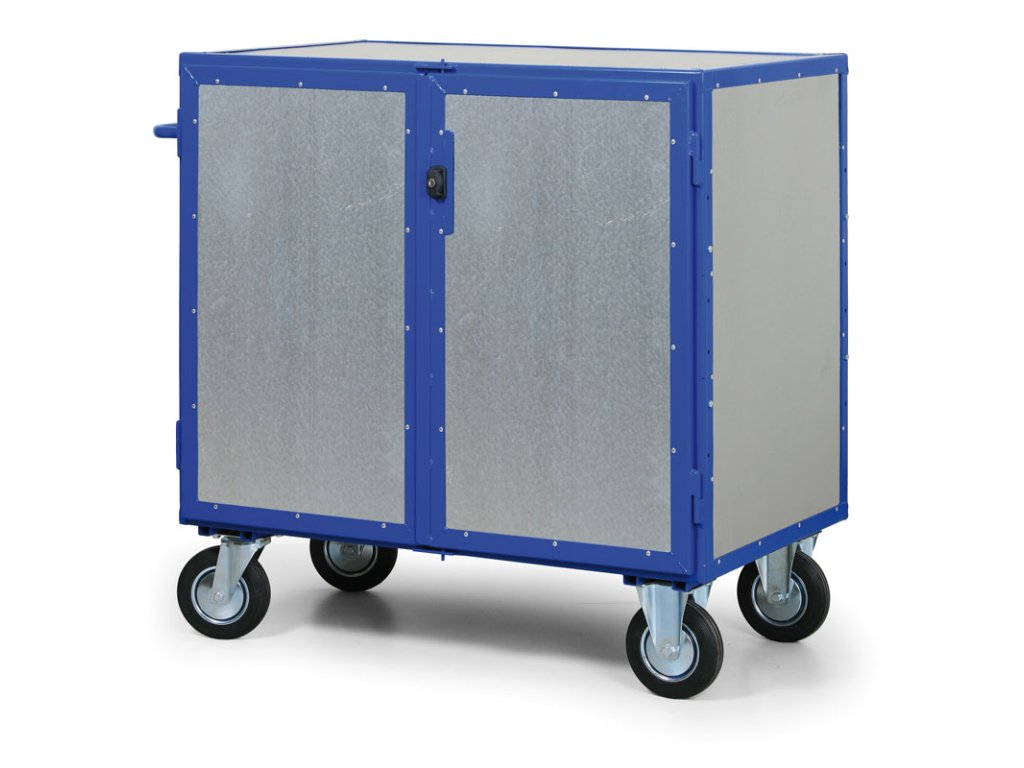 Tento vozík slouží k přepravě a uskladnění položek, které potřebujete chránit před odcizením. Velikost plošiny je 1200 x 800 mm a celková výška 1250 mm. Nosnost vozíku je 600 kg. Pevná svařovaná konstrukce zajišťuje stabilitu. Kostra vozíku je svařena z ocelových profilů. Stěny a horní víko jsou z pleiva s oky 50 x 50 mm, nebo ze zinkovaného plechu. Vozík je vybaven dvojitými křídlovými dveřmi s cylindrickým zámkem. Součástí dodávky jsou 2 klíče. Kola na vozíku jsou vybavena poklicí, která brání namotávání nití a provázků a také zanášení ložiska různými nečistotami, čímž se prodlužuje životnost, jsou o průměru 200 mm, dvě pevná a dvě otočná podle vlastní osy. Jedno otočné kolečko vybaveno brzdou. Kovové části jsou lakovány práškovým lakem RAL 5005. Dno je z laminované dřevotřísky, která je vsazena do ocelového rámu.Police z laminované dřevotřísky jsou přestavitelné po 10 cm.