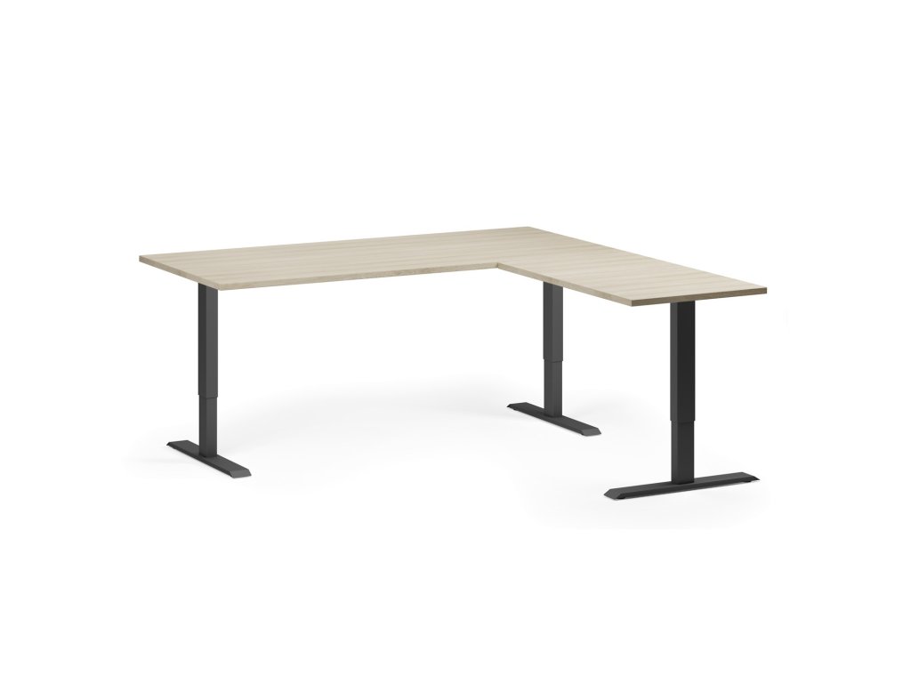 Rohový výškově nastavitelný stůl, 180x180 cm, 3 motory, L/P, černá podnož, dub přírodní