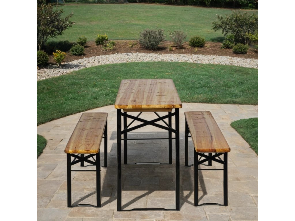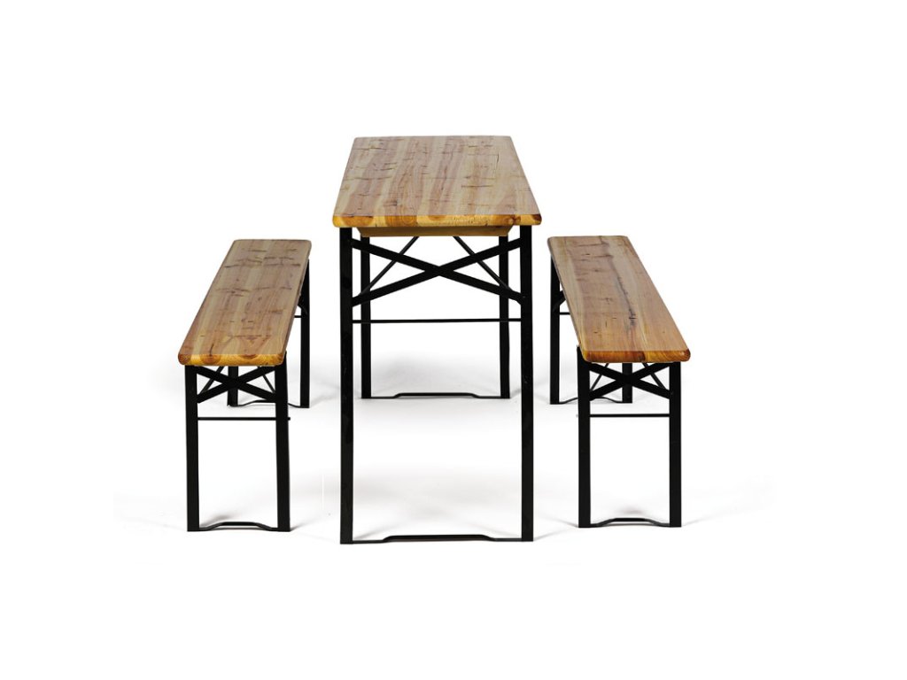 Tento jednoduchý skládací zahradní pivní set je ideální pro pořádání různých kulturních či gastronomických akcí na zahradě, nebo třeba v restauračních zařízeních. Set se skládá ze stolu a dvou lavic. Rámy jsou vyrobeny z černé kovové konstrukce s povrchovou úpravou práškovým lakováním, což zajišťuje vysokou odolnost proti povětrnostním vlivům.