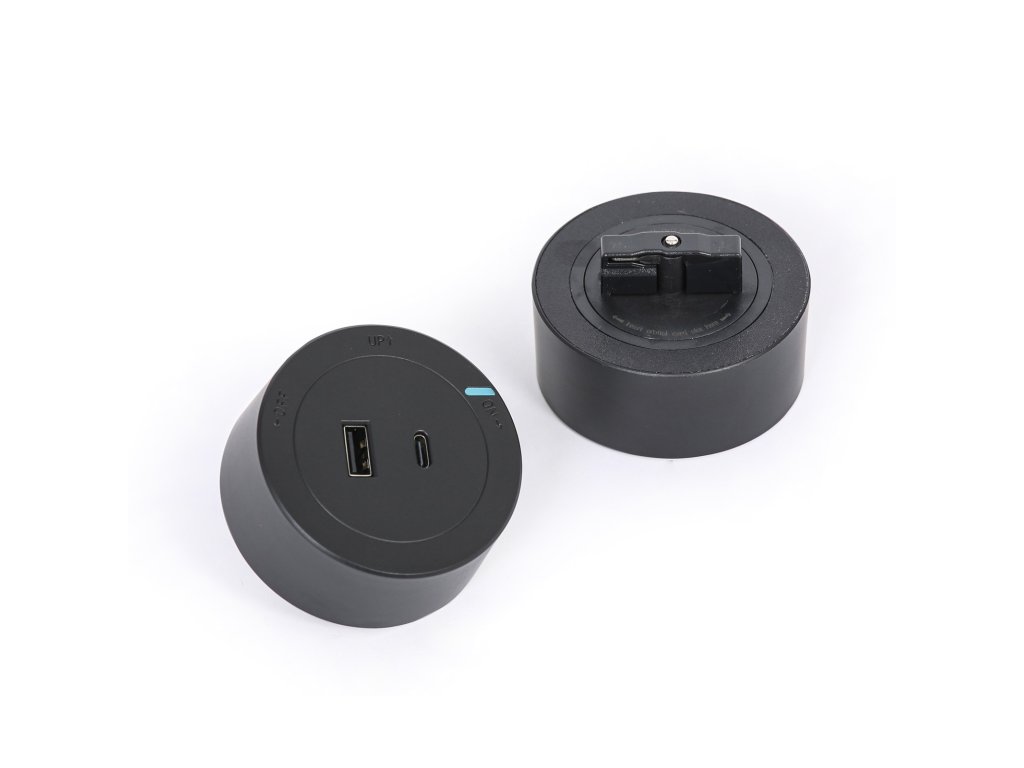 Tento kulatý modul je určen pro zabudování do zásuvkových lišt z naší nabídky. V elegantním černém provedení s decentním modrým indikátorem napájení nabízí USB-A a USB-C rozhraní pro snadné nabíjení zařízení. Velice snadná montáž do lišty pouhým pootočením.
