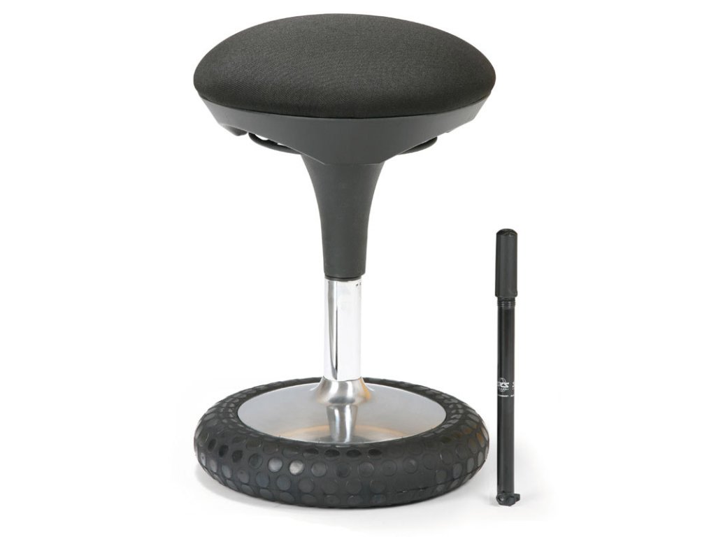 - podlahový talíř z leštěného kovu je opatřen pneumatikou, kterou je možno nahustit dle hmotnosti sedícího k dosažení příjemného balancování